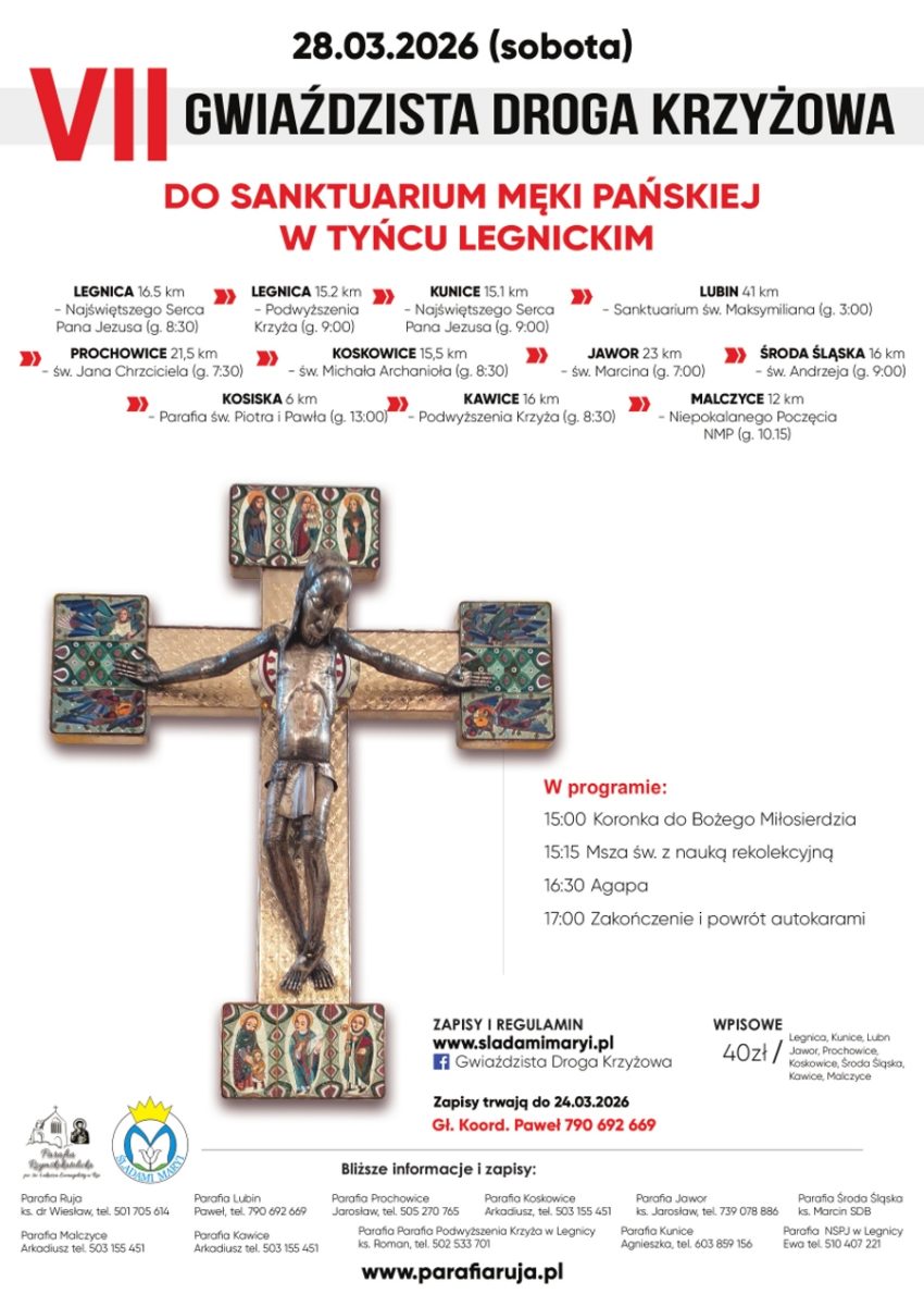 Zapraszamy do udziału w VII Pieszej Drodze Krzyżowej do Sanktuarium Męki Pańskiej w Tyńcu Legnickim w dn. 28 marca br. Wyjście o godz. 9.00 z kościoła parafialnego. Trasa ok. 16 km. Powrót do Środy Śląskiej na godz. 17.00. Podczas Drogi Krzyżowej obowiązuje cisza. Koszt 40 zł. (pamiątkowy krzyż, przejazd autobusem).